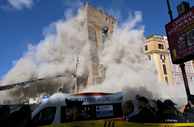 En las imágenes de video, casi parece un terremoto. La antigua Torre dei Conti, que ha ocupado una esquina del centro de Roma desde la época medieval, se ve repentinamente envuelta en nubes ondulantes mientras los ladrillos caen de un agujero en su costado. A medida que se derrumba más estructura interna, escombros y polvo salen disparados por ventanas y aberturas, cayendo sobre la calle.