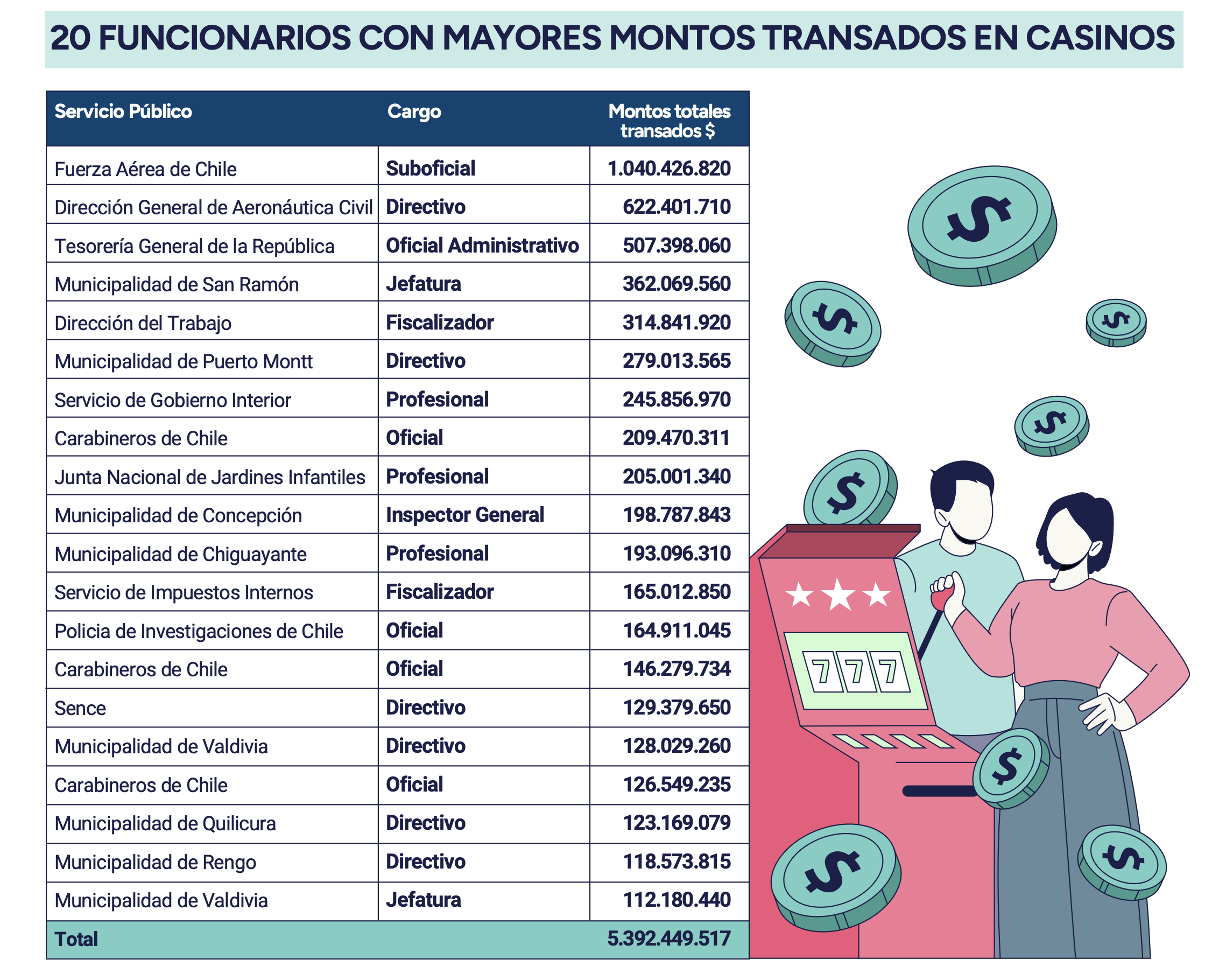 Según los datos recogidos en el CIC N° 20 de la Contraloría, “erl nuevo consolidado del organismo de control se basó en el cruce de información entre el registro de funcionarios que administran o custodios fondos públicos -y que por ello deben rendir caución- y los antecedentes de clientes que realizaron operaciones en casinos de juego, proporcionados por la Superintendencia de Casinos de Juego (SCJ)”.