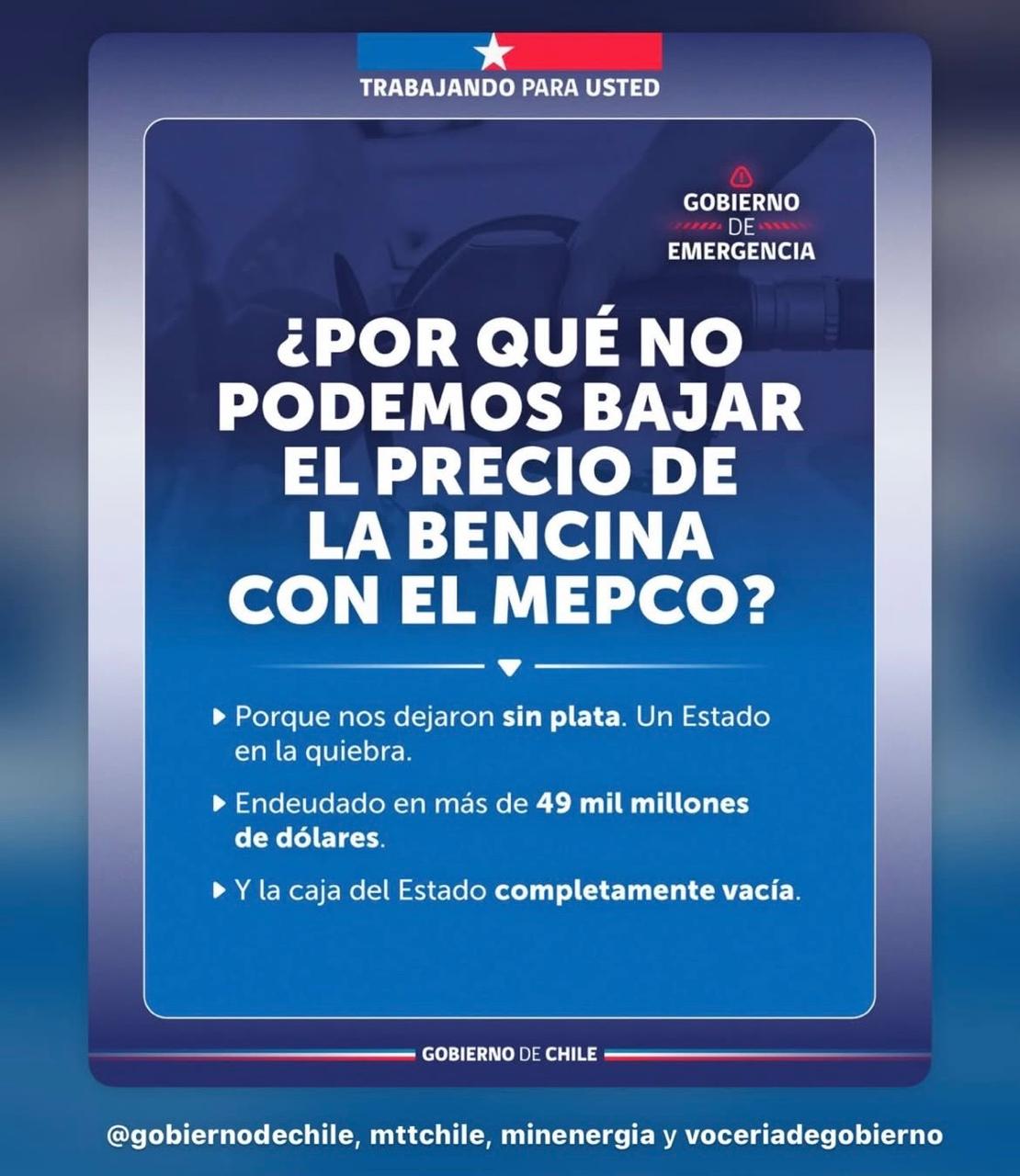 ¿Por qué no podemos bajar el precio de la bencina con el Mepco?“. Esa pregunta se trató de responder ayer en las cuentas oficiales del Gobierno de Chile en redes sociales como Instagram. Lo anterior, a partir del anuncio del Ejecutivo de un alza histórica en el precio de los combustibles, derivado de la guerra en Medio Oriente, y que ha provocado un aumento de la desaprobación a la administración del Presidente José Antonio Kast en encuestas, además de una dura arremetida de la oposición.